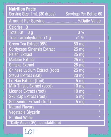 Ingredients: Green tea extract, four medicinal mushrooms (maitake, reishi, shitake, and cordyceps), schisandra, milk thistle, Chinese skullcap, Chinese licorice
